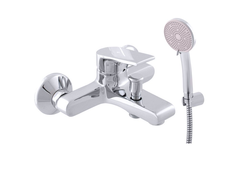 Настенный смеситель для ванны с душем и фиксированным держателем.