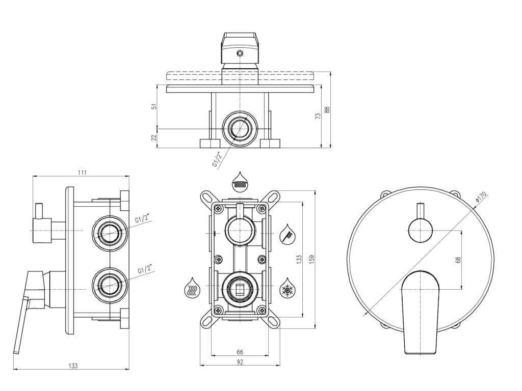 Встроенный смеситель для душа/ванны с кнопочным переключателем.