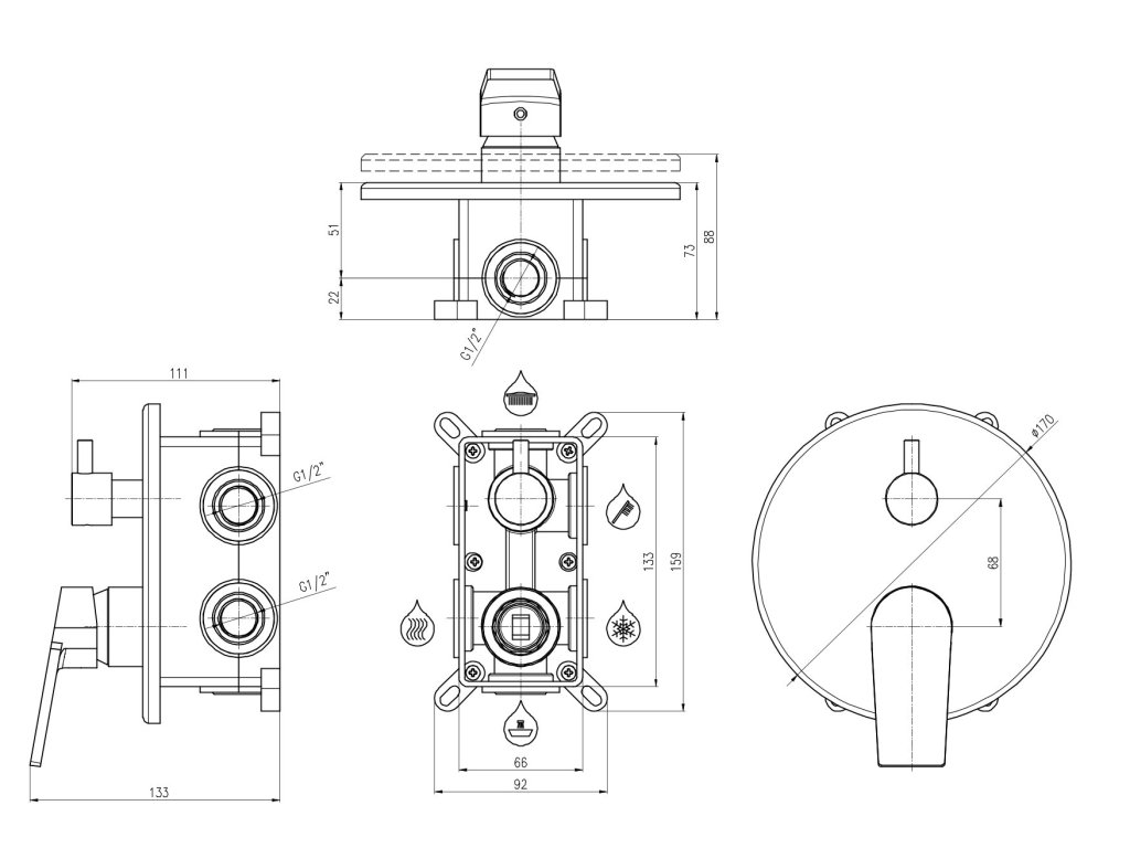 Этот смеситель можно использовать как в душевой кабине как комбинацию из трех элементов , так и в ванне как комбинацию, например, перелива, ручного душа и верхнего душа или излива, ручного душа и верхнего душа.