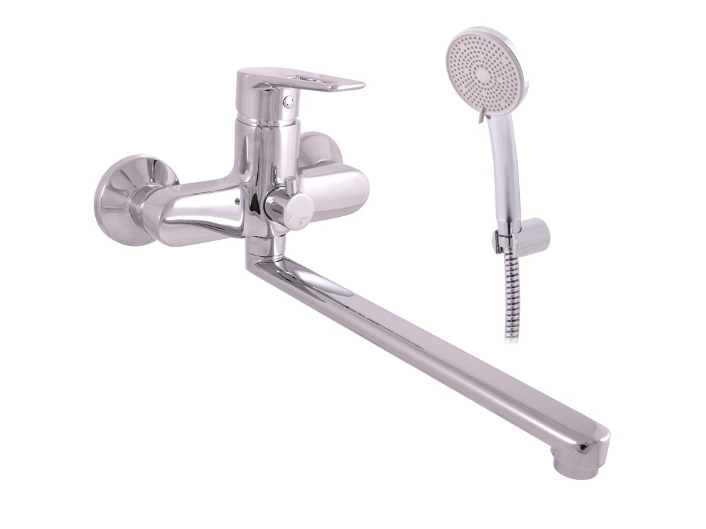 Настенный смеситель для ванны и умывальника с плоским поворотным рычагом, душем и фиксированным кронштейном.