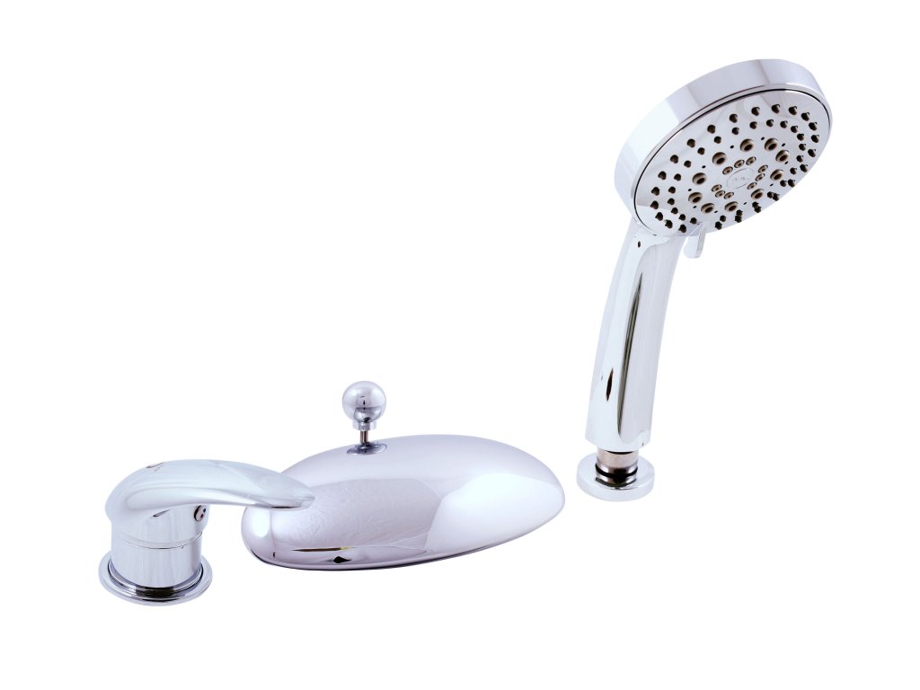 Отдельно стоящий смеситель для ванны на три отверстия с переключателем в изливе, самозатягивающимся душем и шлангом длиной 2 м.