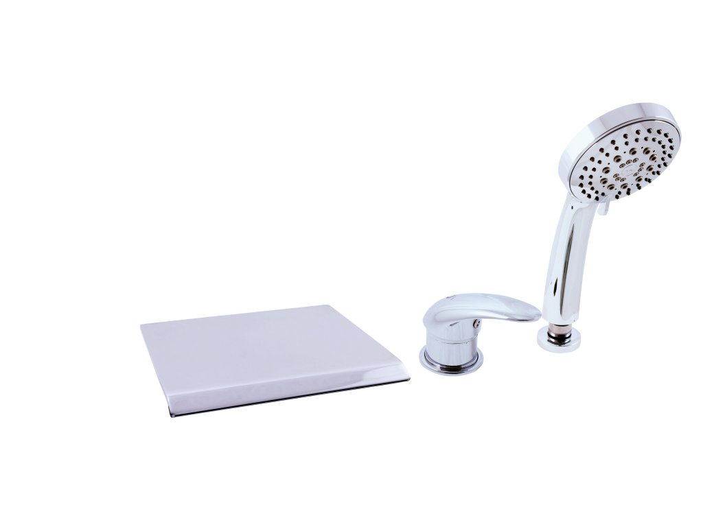 Отдельно стоящий смеситель для ванны на три отверстия с переключателем в смесителе, самозатягивающимся душем и шлангом длиной 2 м.