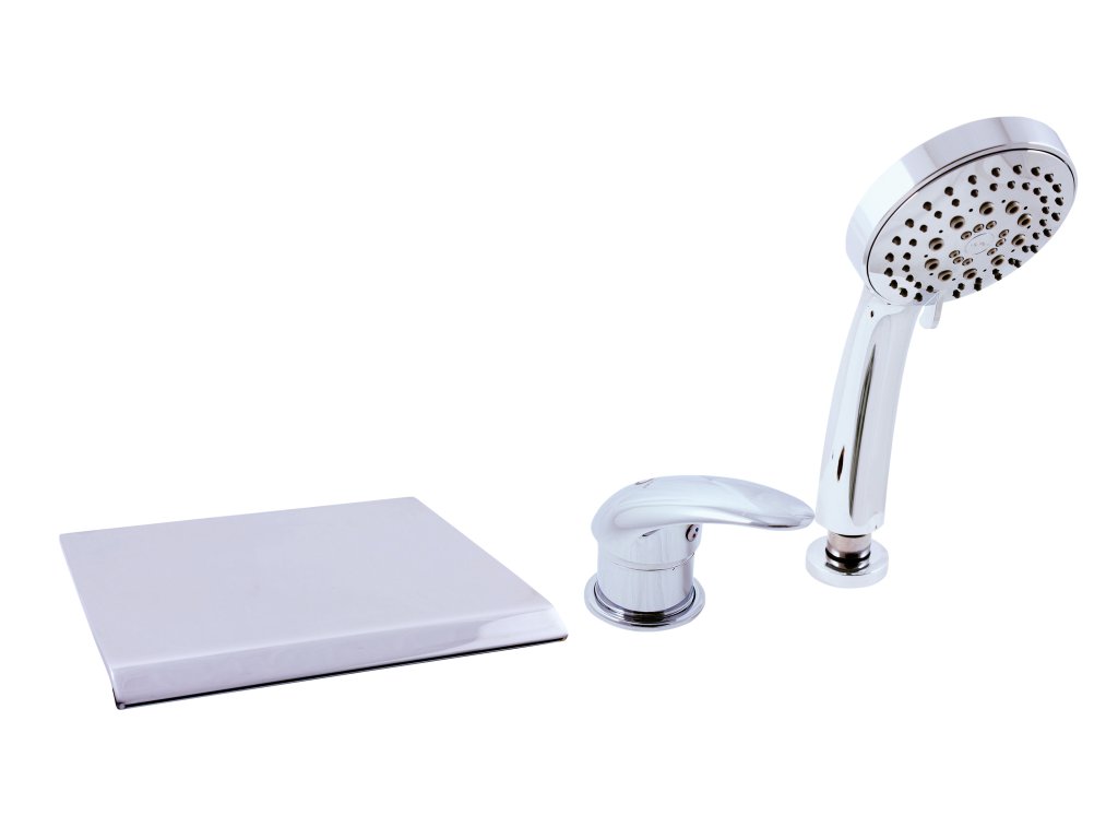 Отдельно стоящий смеситель для ванны на три отверстия с переключателем в смесителе, самозатягивающимся душем и шлангом длиной 2 м.