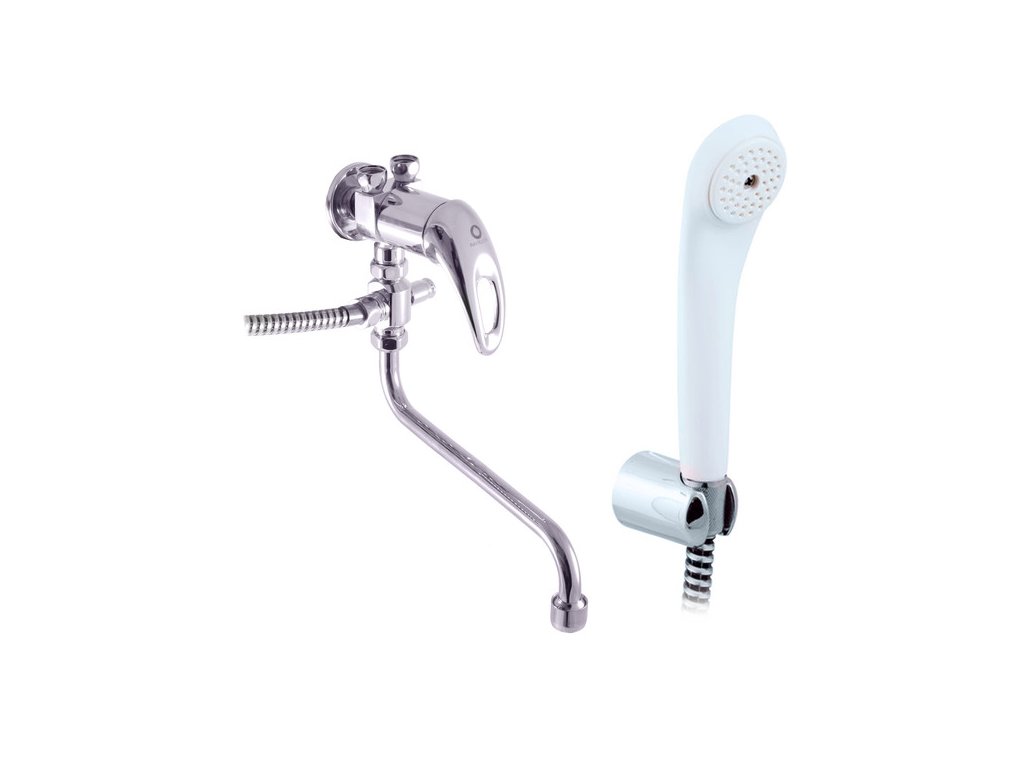 Однорычажный смеситель для ванны и умывальника с настенным креплением, с розеткой, шлангом и фиксированным держателем для проточных водонагревателей.