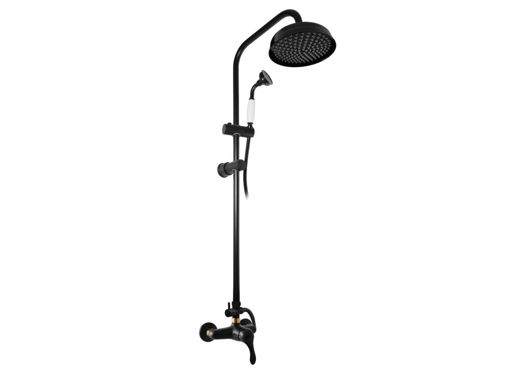LABE - смеситель для душа с душевым набором и стойкой с головной лейкой, цвет черный матовый/золотистый глянцевый, арт. L081.5/7CMATZ, RAV Slezák