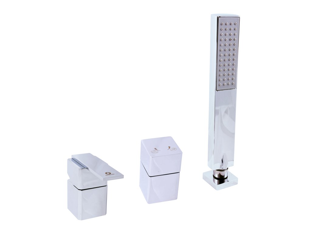 Отдельно стоящий смеситель для ванны на три отверстия с керамическим переключателем, самовтягивающимся шлангом длиной 2 м и душем, для наполнения через сифон-перелив.