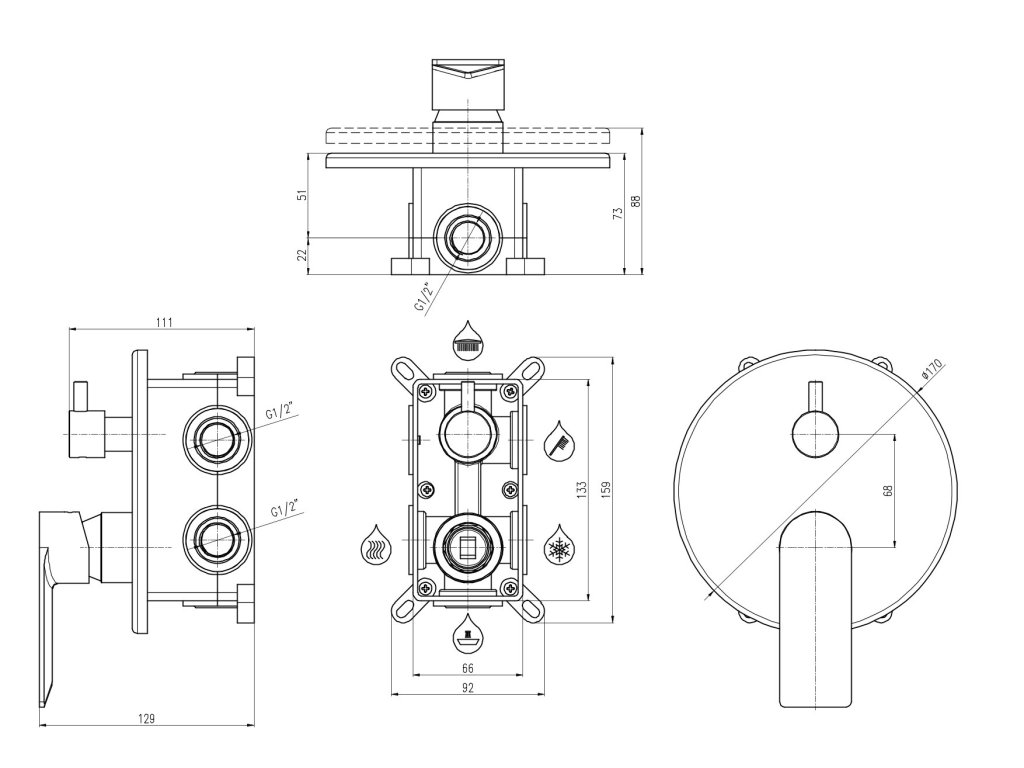 Этот смеситель можно использовать как в душевой кабине как комбинацию из трех элементов , так и в ванне как комбинацию, например, перелива, ручного душа и верхнего душа или излива, ручного душа и верхнего душа.