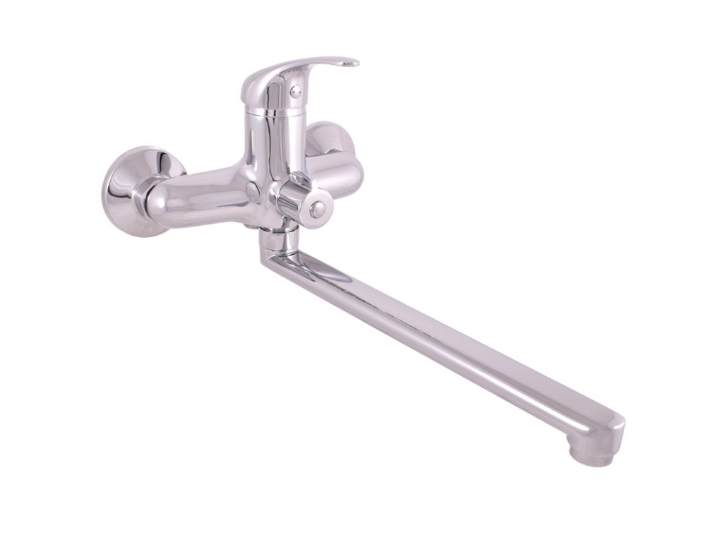 Настенный смеситель для ванны и умывальника с плоским поворотным рычагом.