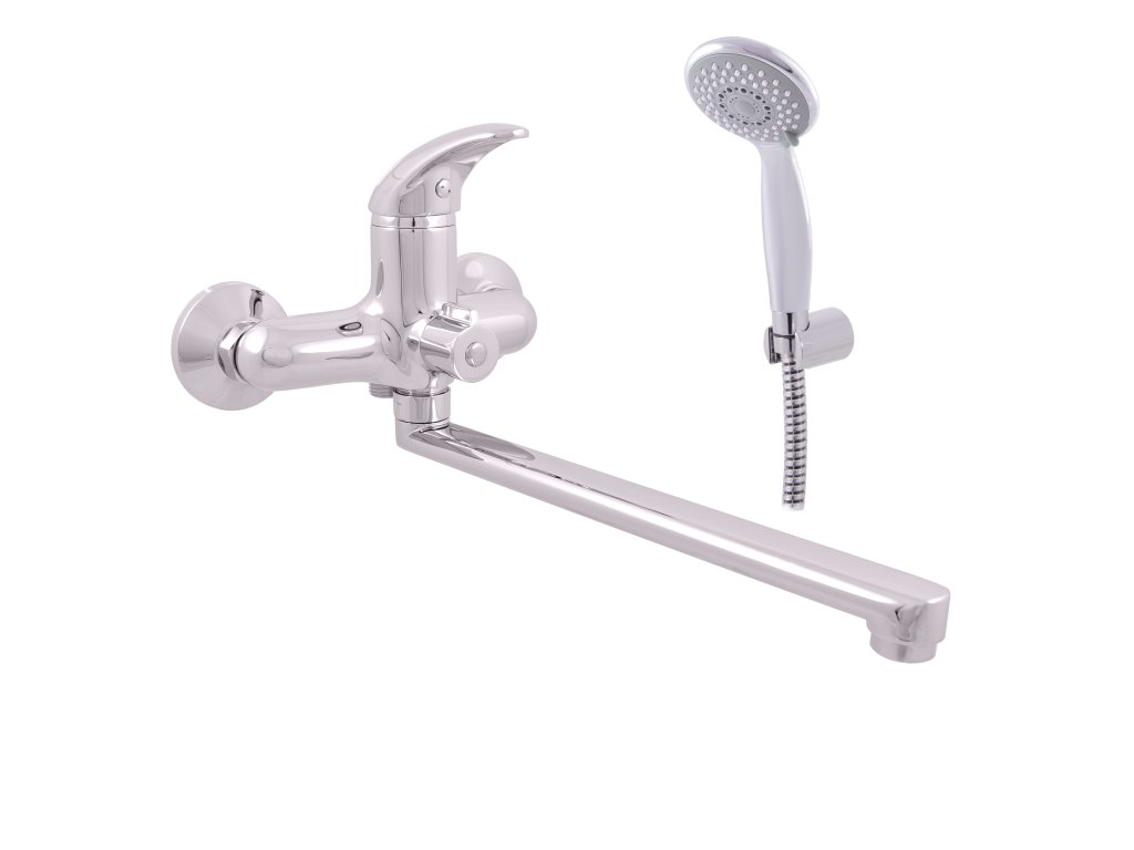 Настенный смеситель для ванны и умывальника с плоским поворотным рычагом, душем и фиксированным кронштейном.