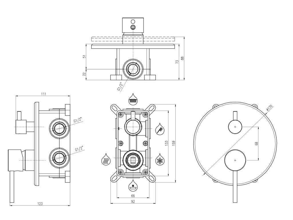 Этот смеситель можно использовать как в душевой кабине как комбинацию из трех элементов , так и в ванне как комбинацию, например, перелива, ручного душа и верхнего душа или излива, ручного душа и верхнего душа.