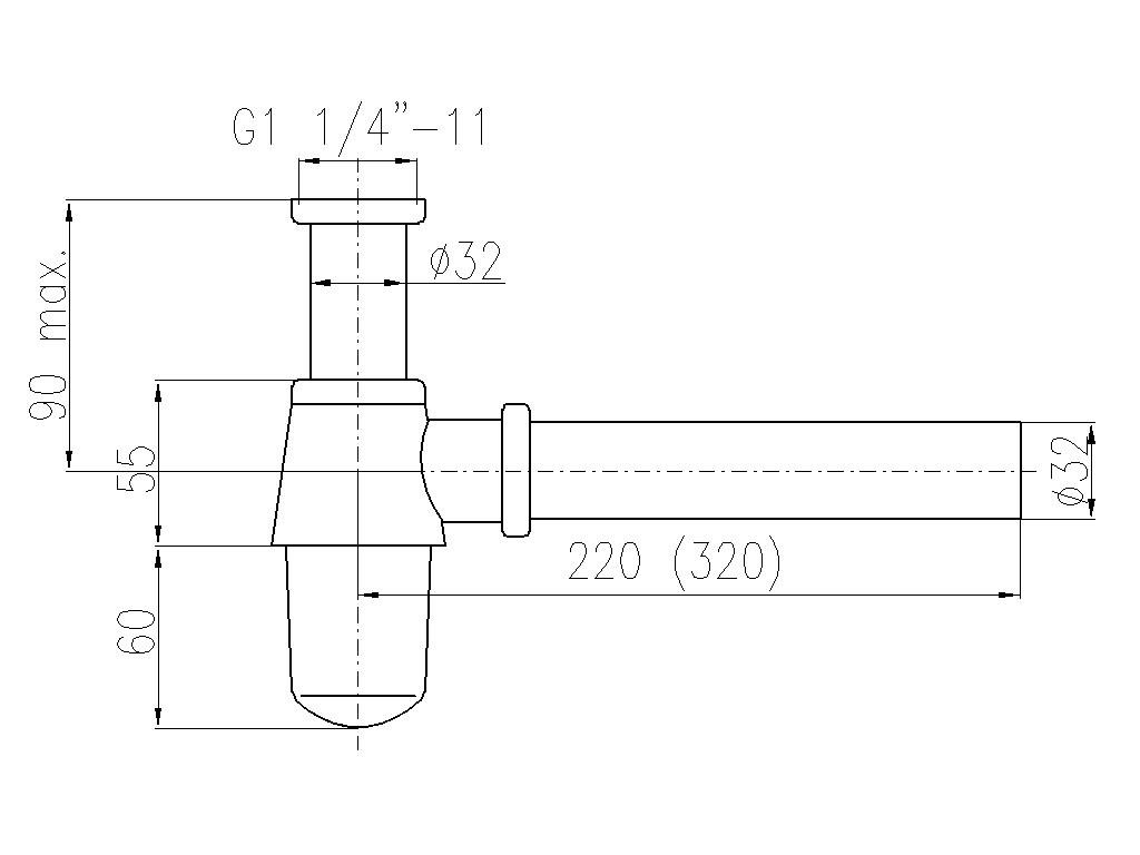 сифон для умывальника 5/4", d32 мм., горизонтальный выпуск 220 мм., металл, цвет золотистый глянцевый, арт. MD0545Z, RAV Slezák