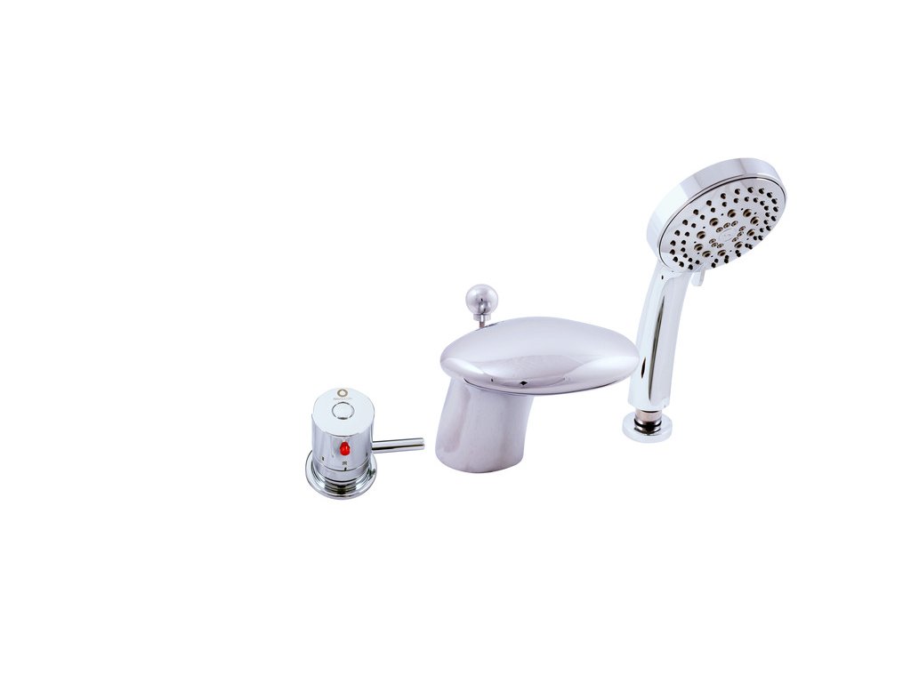 Термостатический смеситель для ванны на три отверстия, с переключателем в изливе, самовтягивающимся шлангом длиной 2 м и душем.
