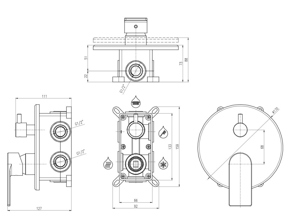 Встроенный смеситель для душа/ванны с кнопочным переключателем.