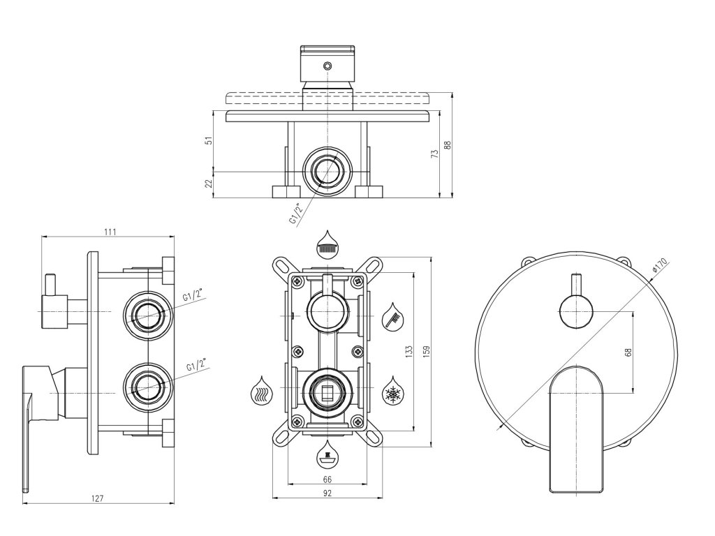 Этот смеситель можно использовать как в душевой кабине как комбинацию из трех элементов , так и в ванне как комбинацию, например, перелива, ручного душа и верхнего душа или излива, ручного душа и верхнего душа.